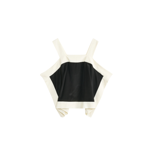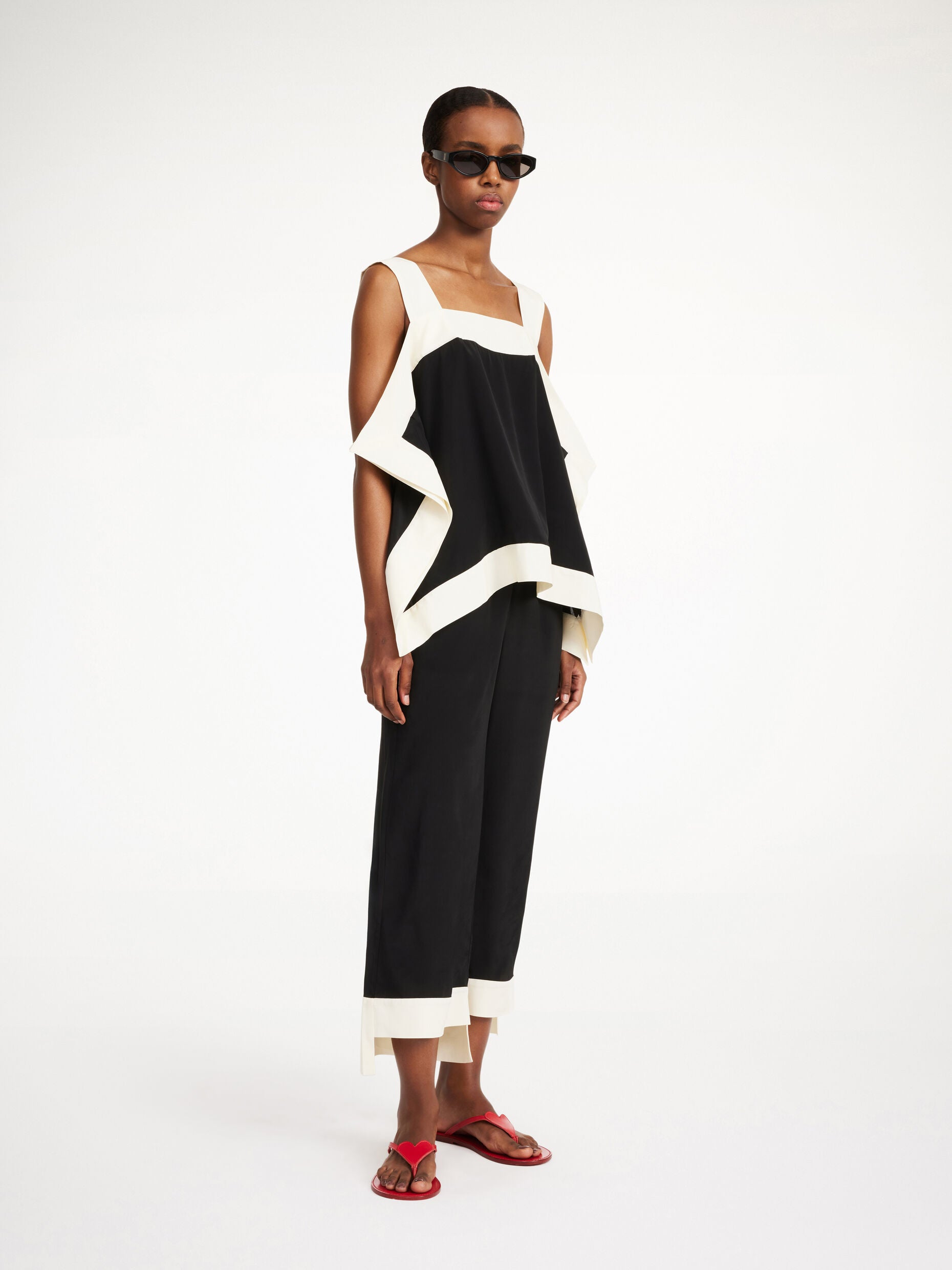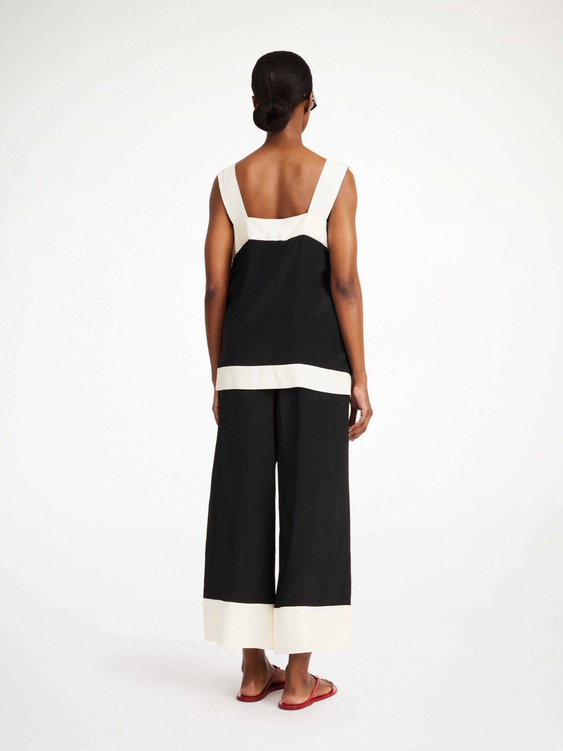 Graphic in its expression and smooth to the touch, the Gabrelle top presents a sophisticated sense of ease. With its wide straps and boxy silhouette, the comfortable design is ideal for warm weekends. Pair with the matching Mirabello trousers.