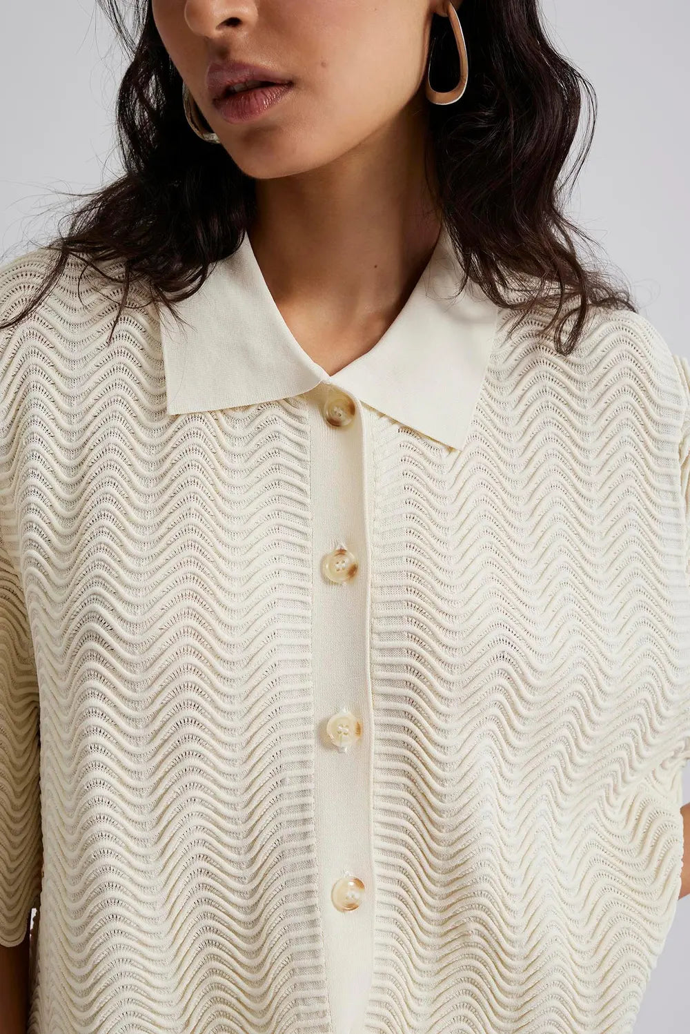 Knitted short sleeve top with a V-neck and scalloped details.