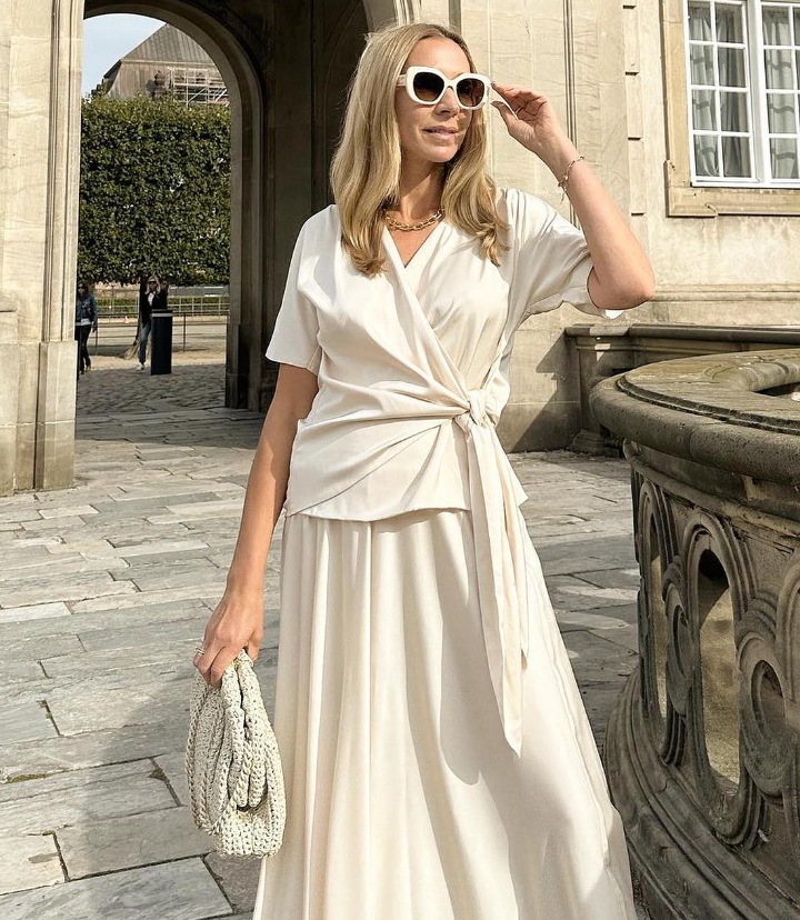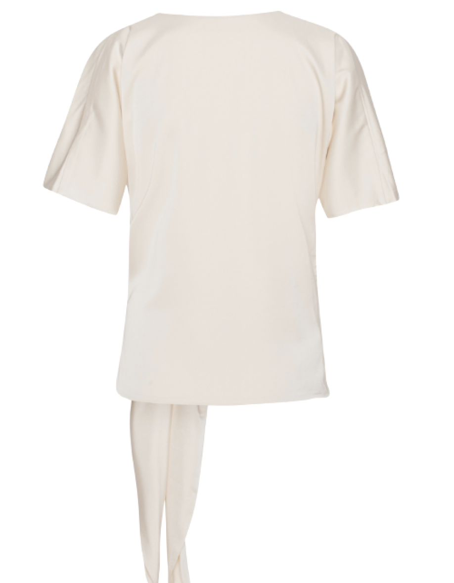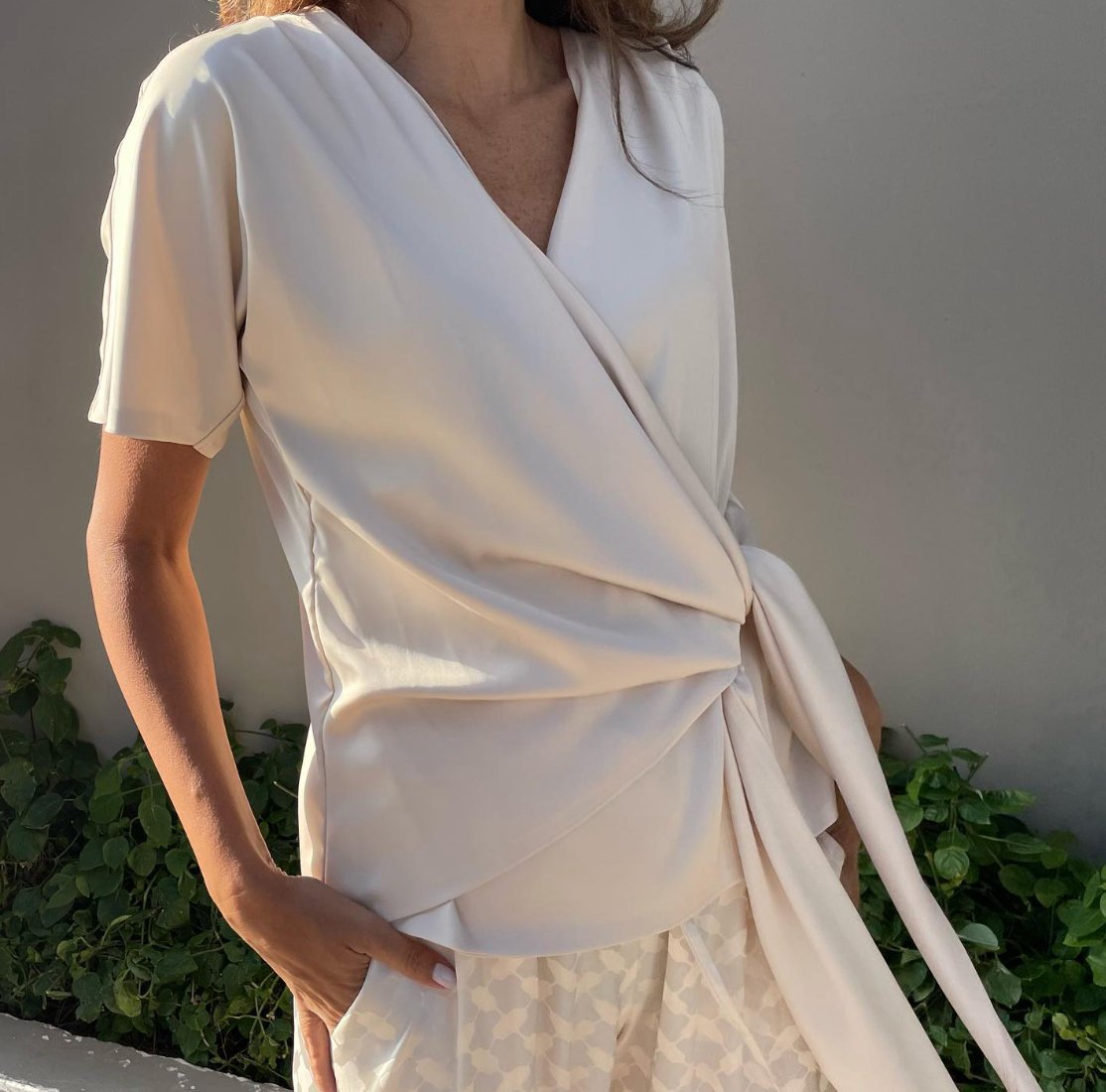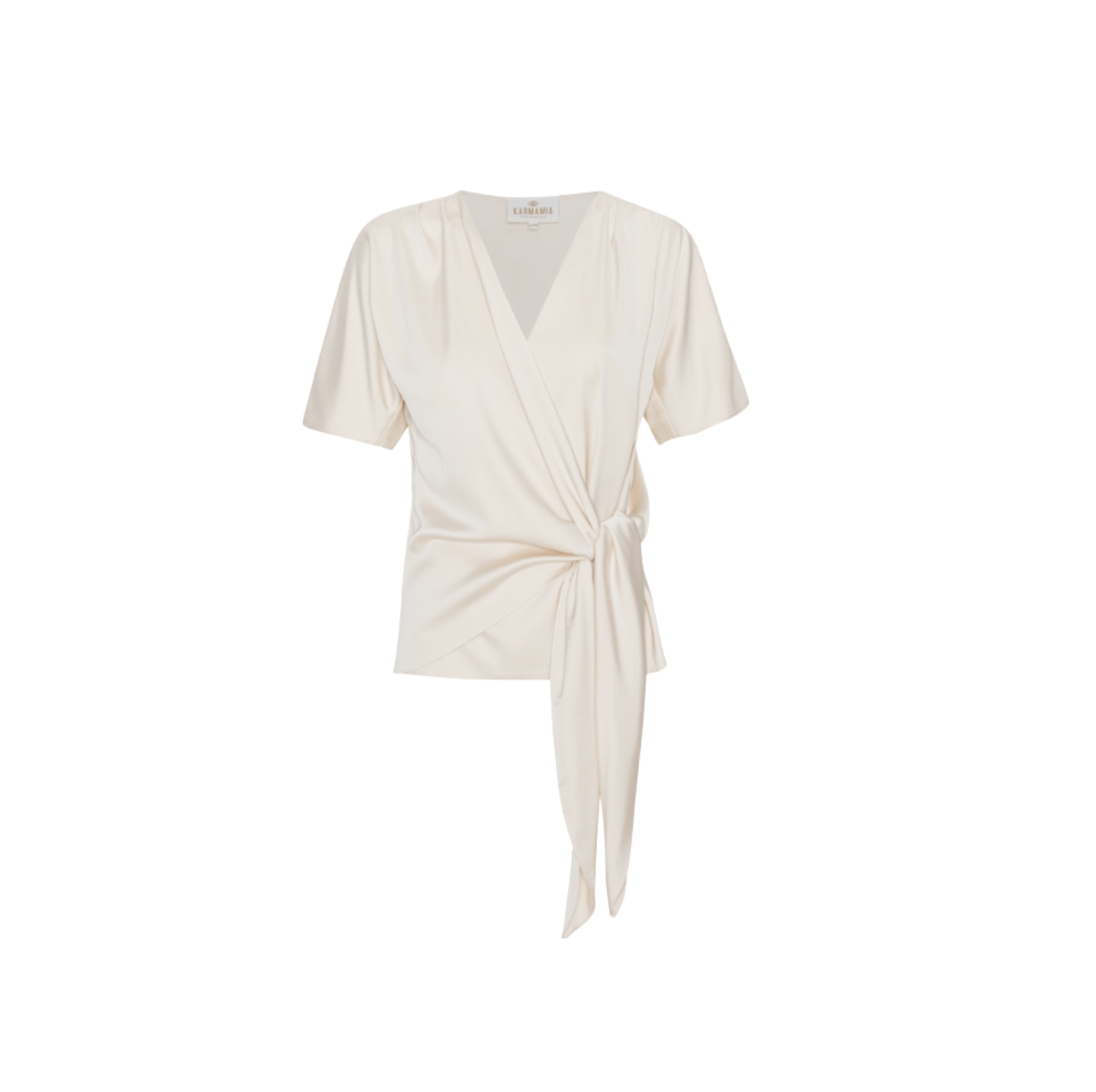 The Dagmar Blouse is a beautiful short-sleeved wrap-around blouse. Satin ribbon gathers at the waist to accentuate your curves.