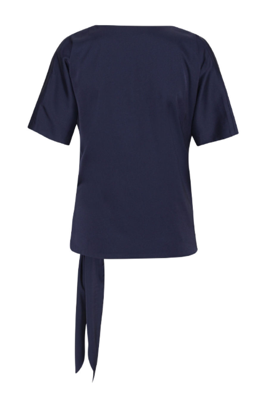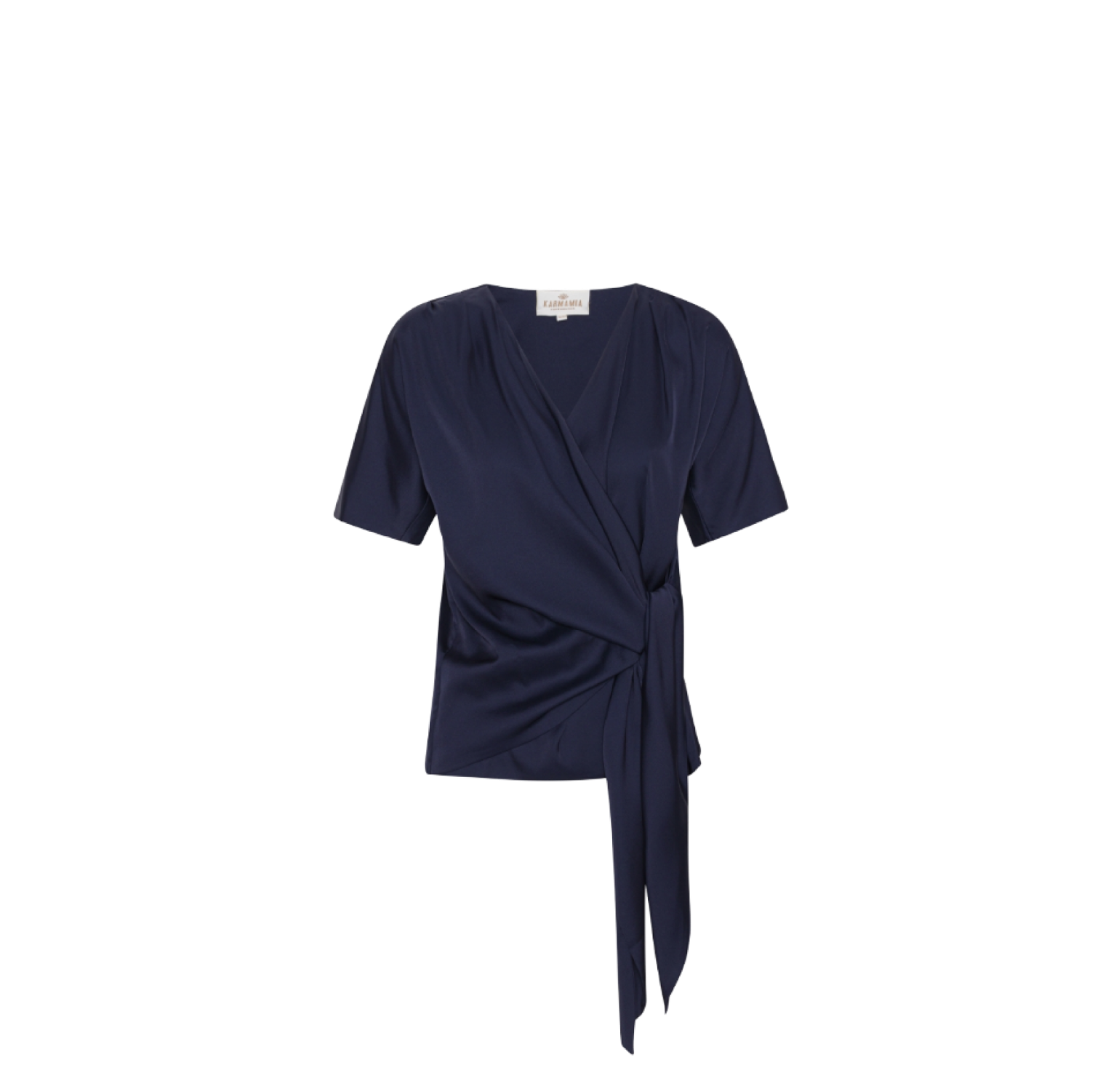 The Dagmar Blouse is a beautiful short-sleeved wrap-over blouse. Satin ribbon gathers at the waist to accentuate your curves.