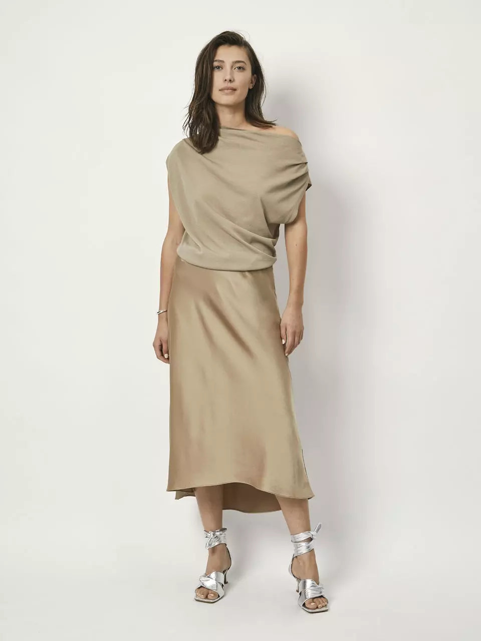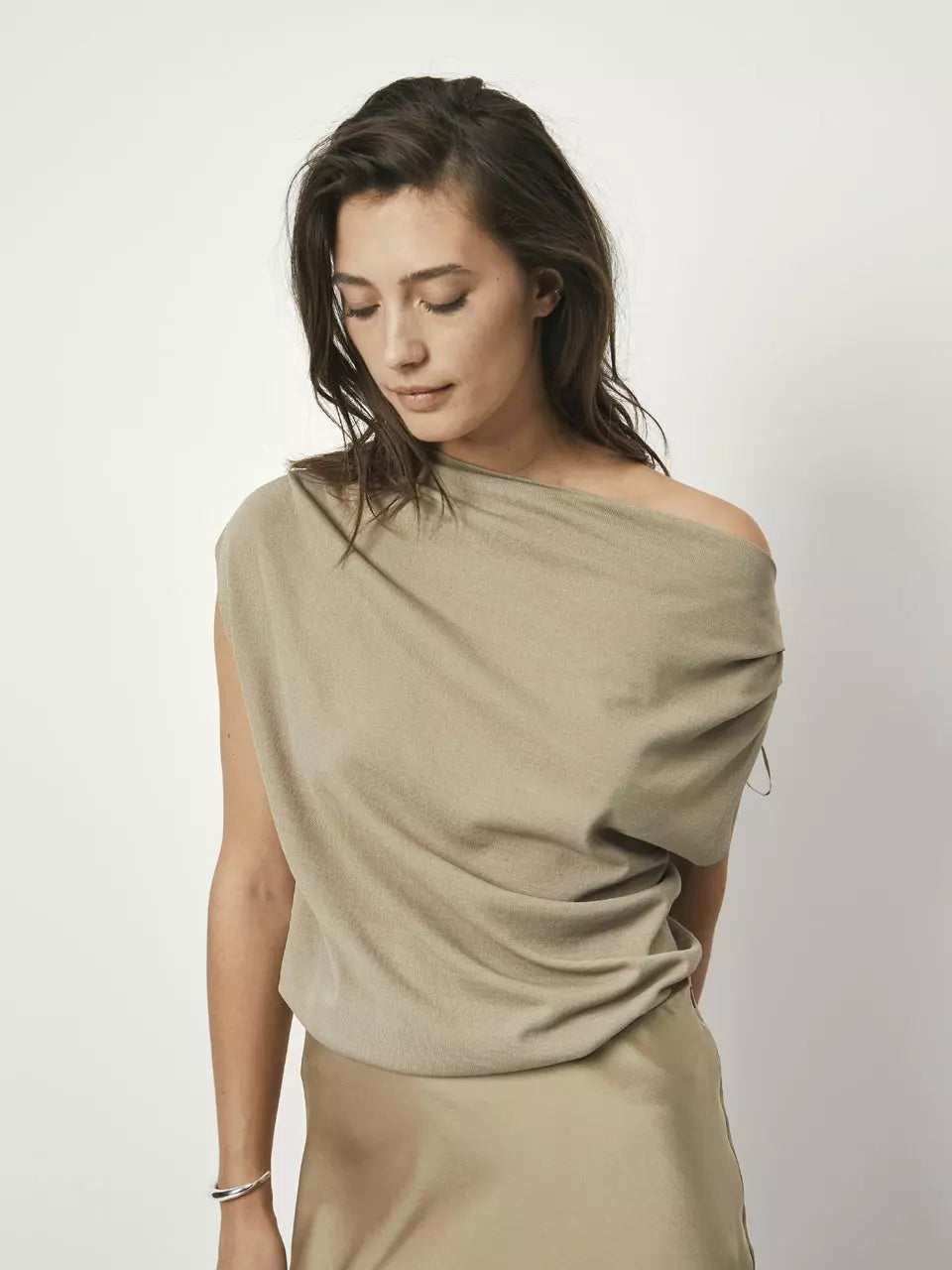 Add an artistic new shape to your knitwear collection with our off-shoulder top, Soroko. This draped top is made from a viscose/polyamide blend.