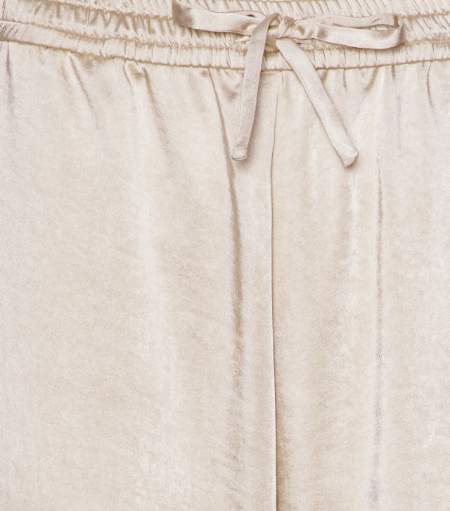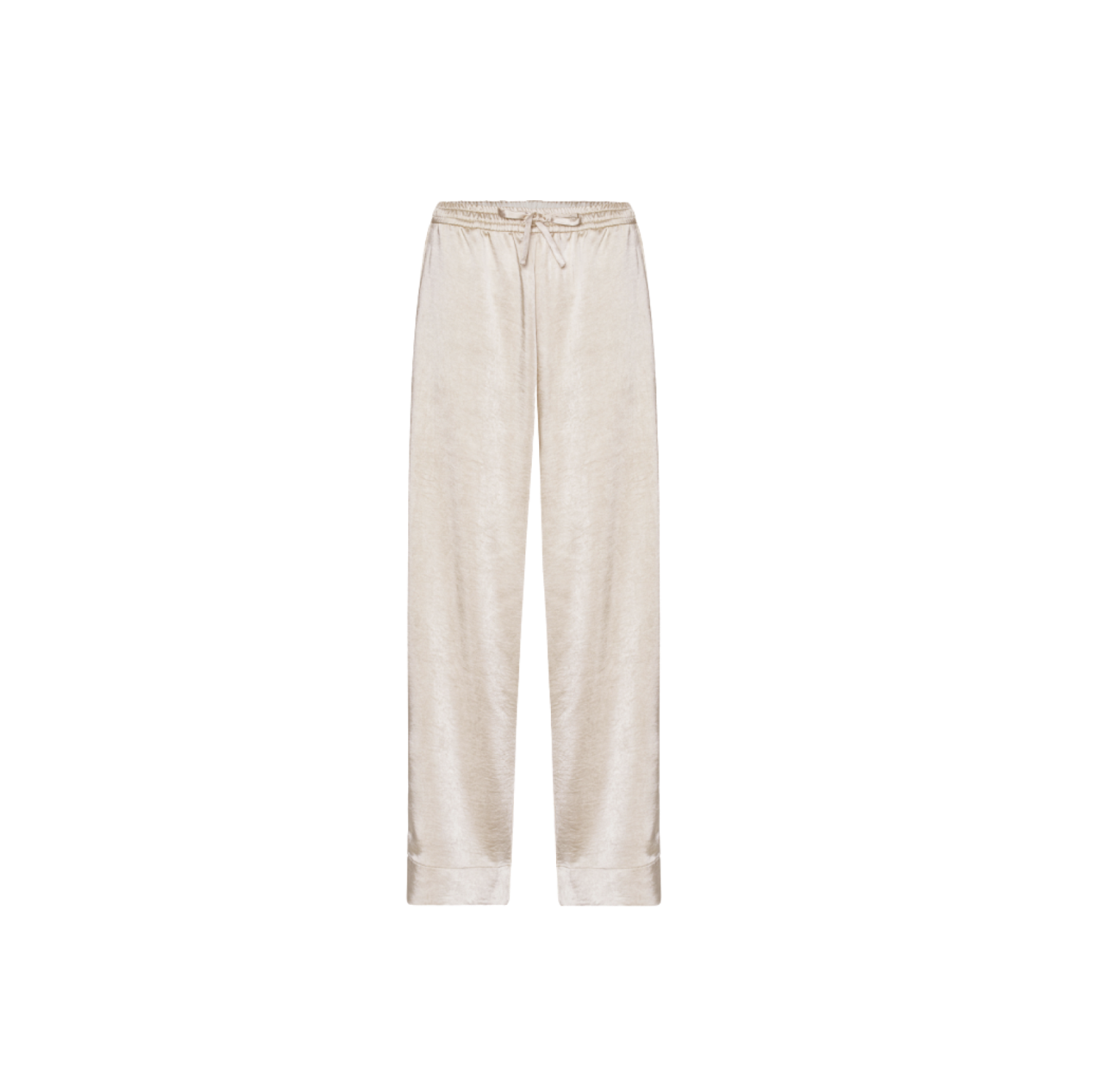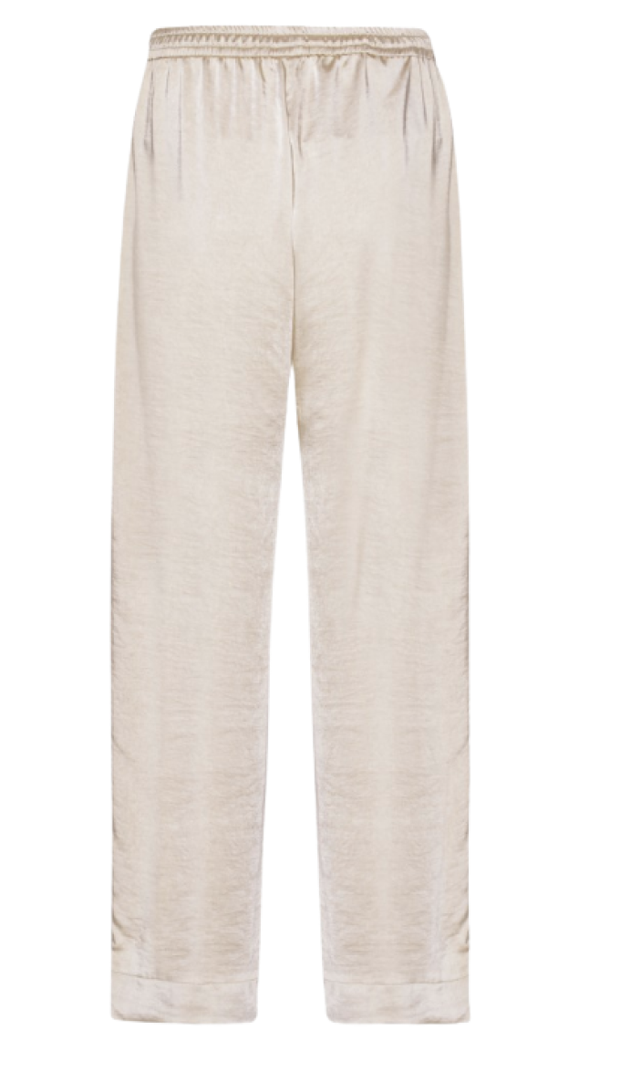 Track-pants style trousers made in an elegant, thick satin material. The trousers have wide legs, two side pockets and elastic and ties at the waist.